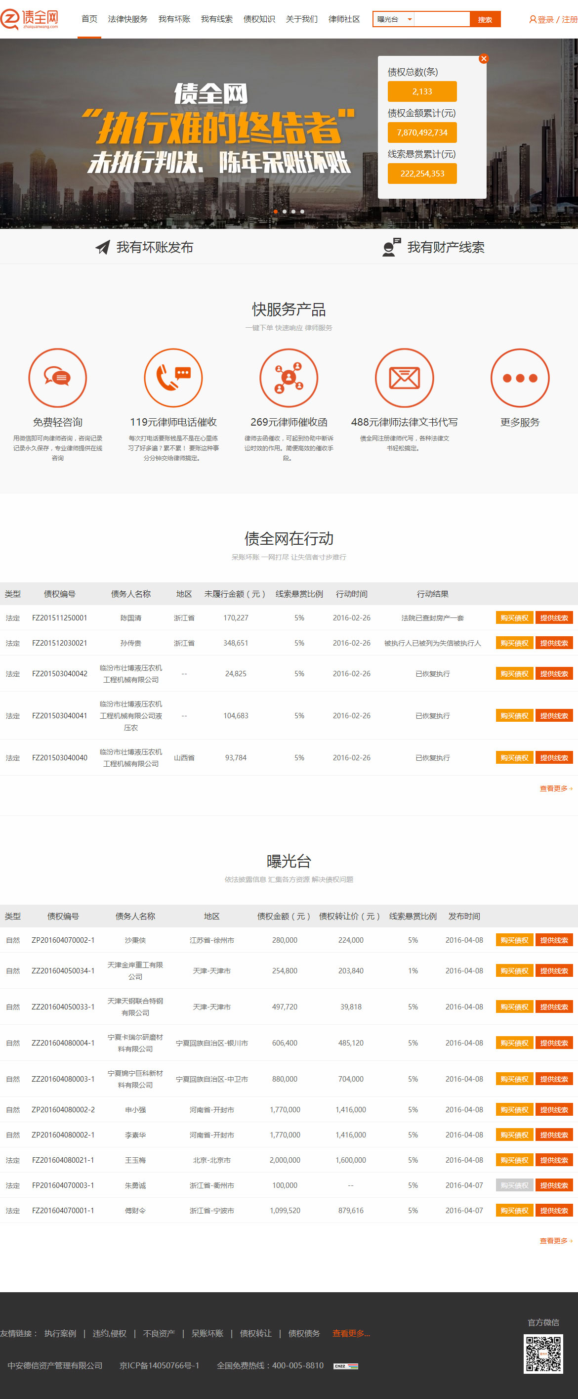 債全網是國內領先的互聯網金融一站式投融資服務平臺,提供互聯網金融“一攬子”服務內容和“一站式”投融資解決方案。